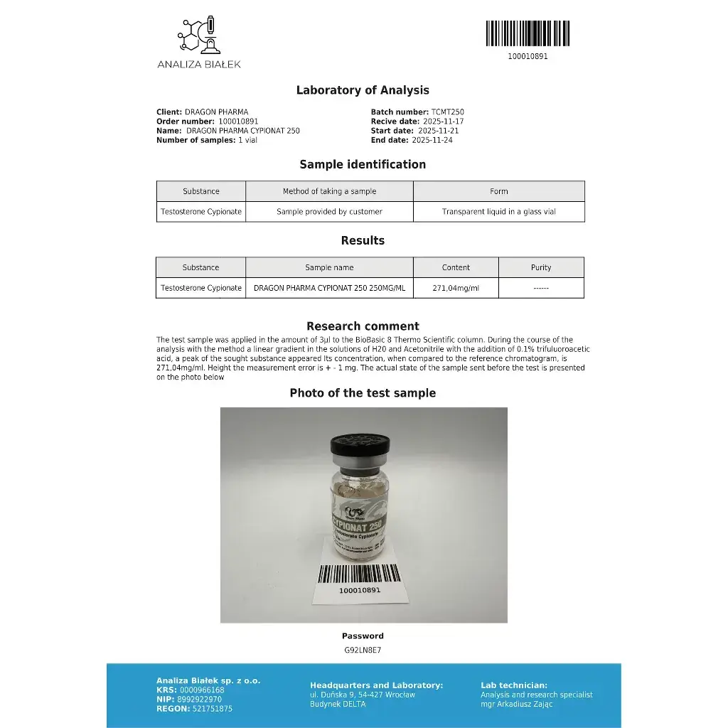Active substance: Testosterone Cypionate (200 mg/mL) in oily solution.